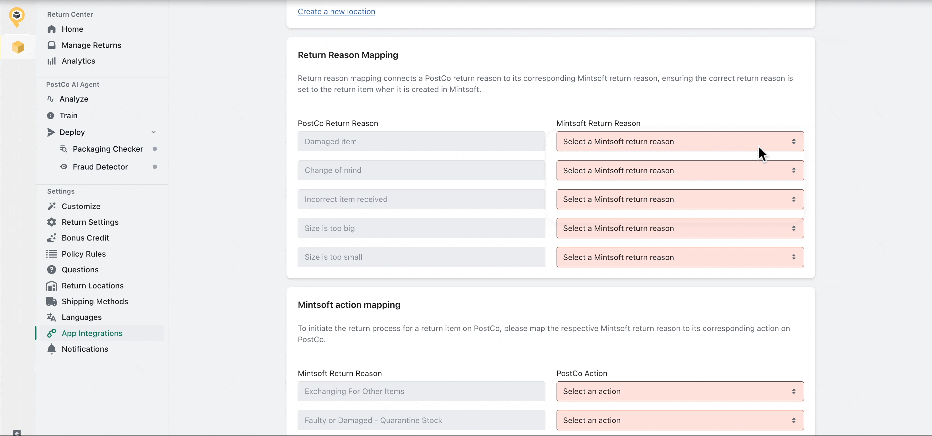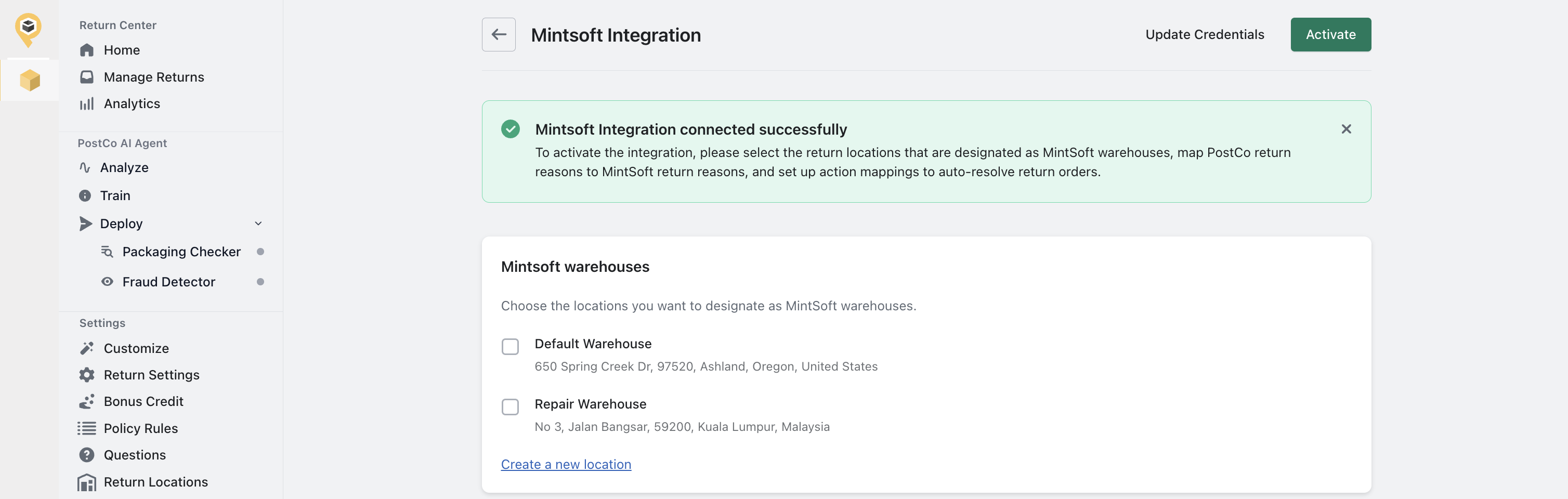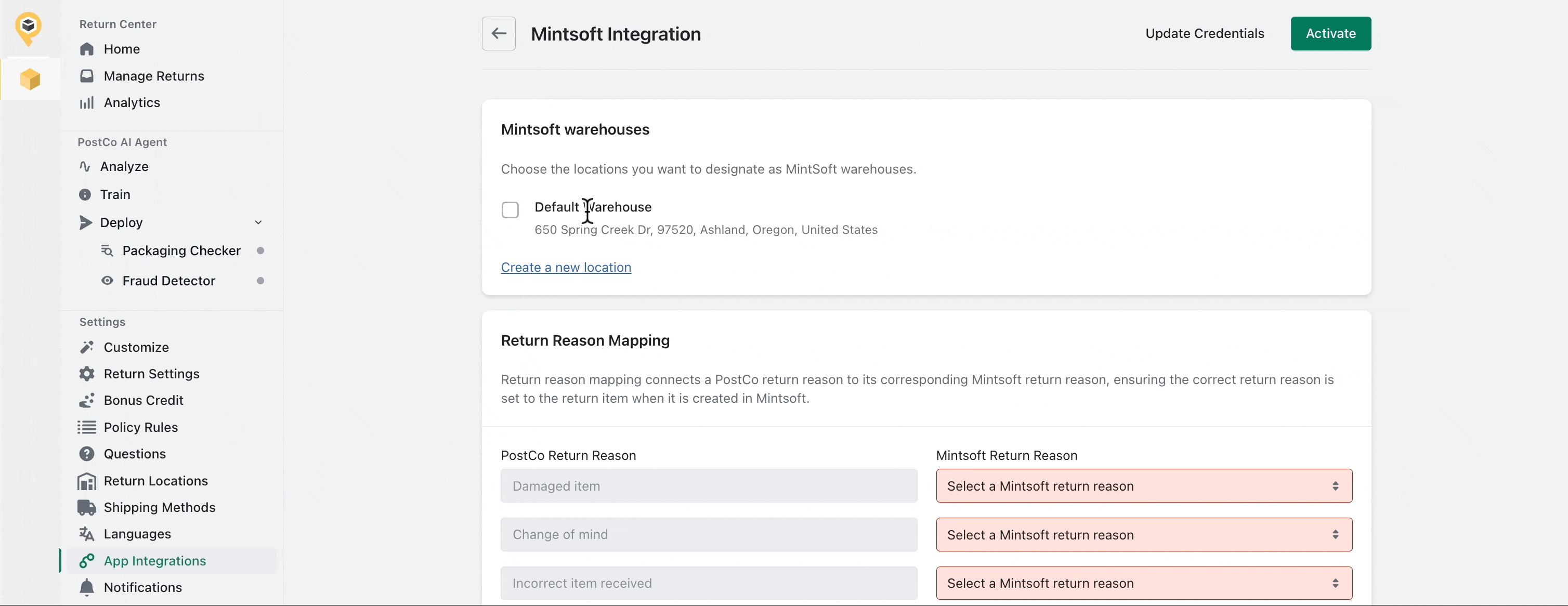 Link each PostCo return location to its respective Mintsoft warehouse, allowing the system to determine when and where to create an RMA in Mintsoft.