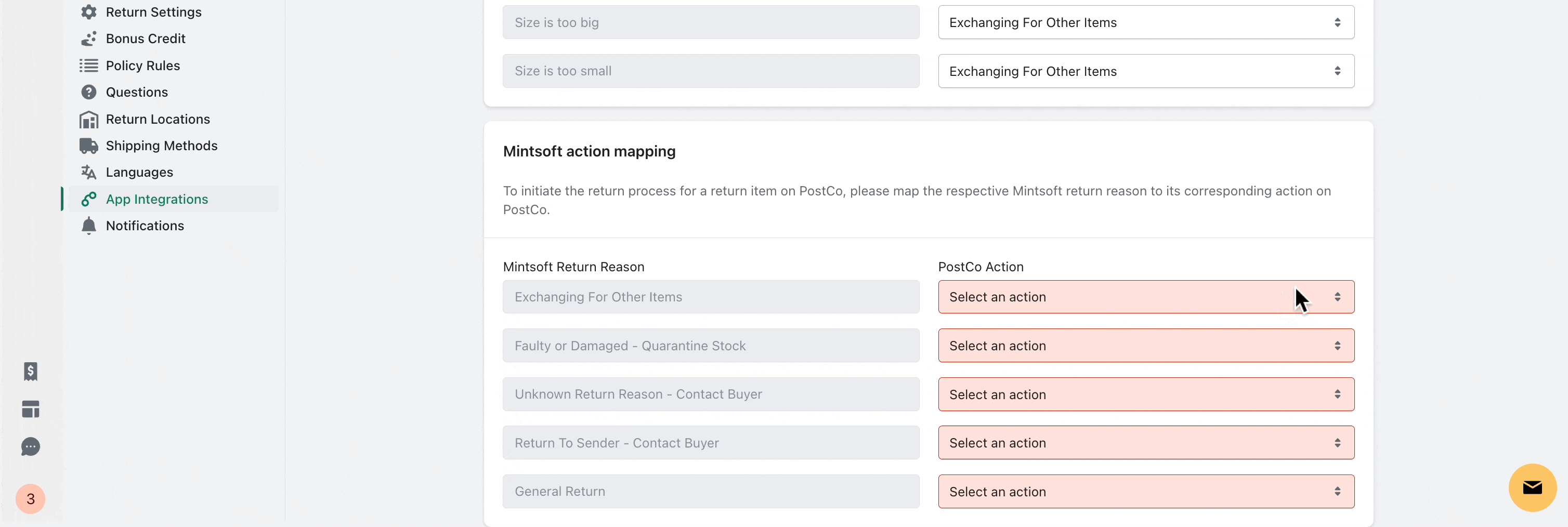 Map each Mintsoft return reason to a PostCo action. When the warehouse has received and inspected the item(s) and the RMA is marked confirmed in Mintsoft, PostCo uses this mapping to automatically resolve the return request.
