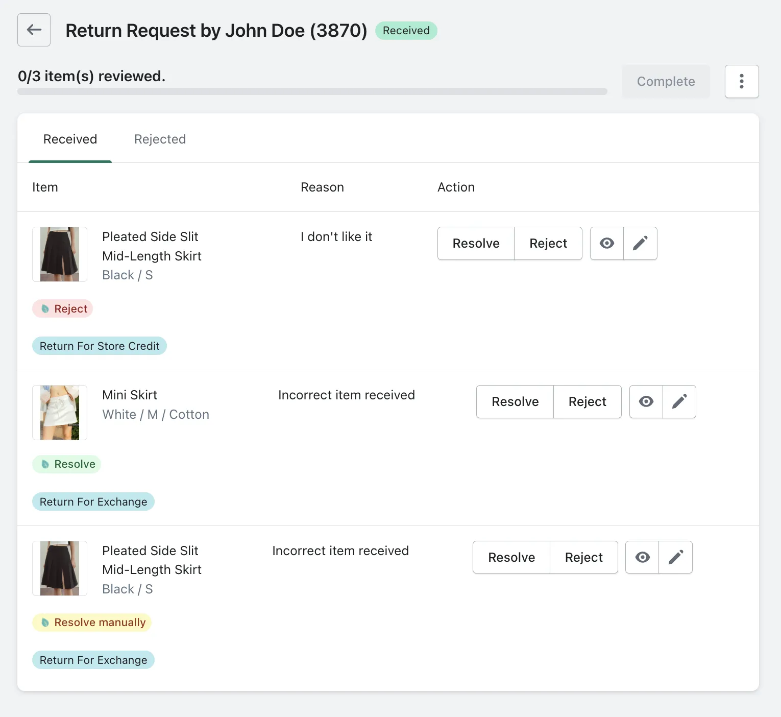 Note: If any return line item within the RMA is mapped to Manual Resolution, the entire return request requires manual completion in the PostCo returns dashboard.