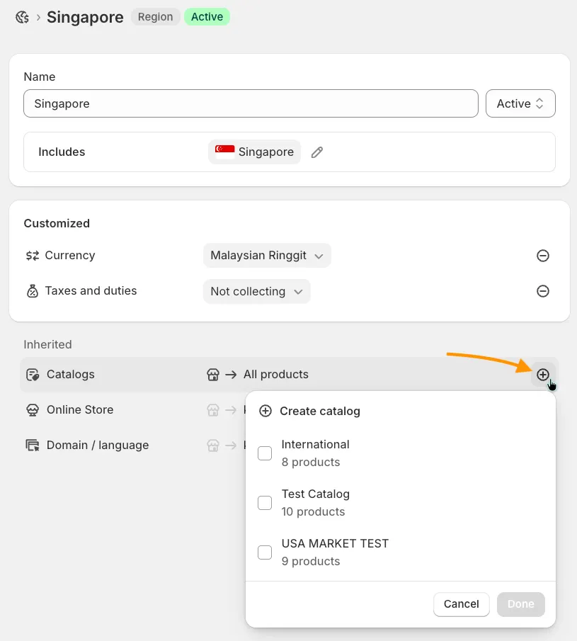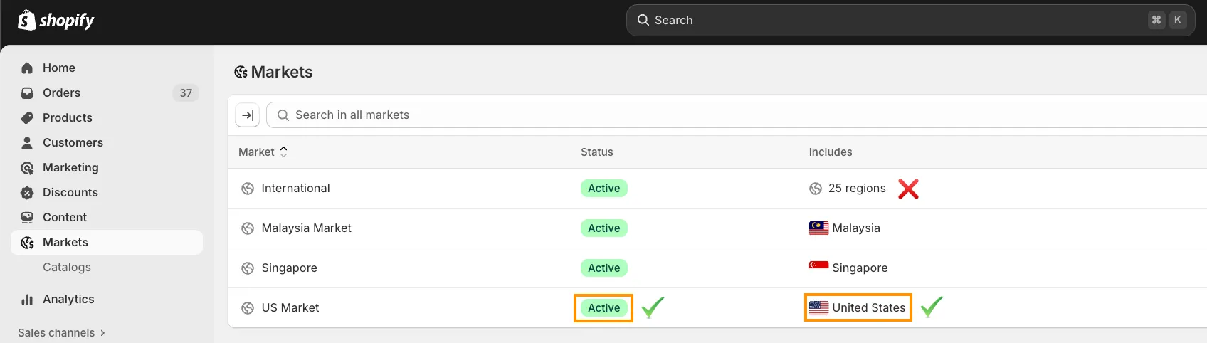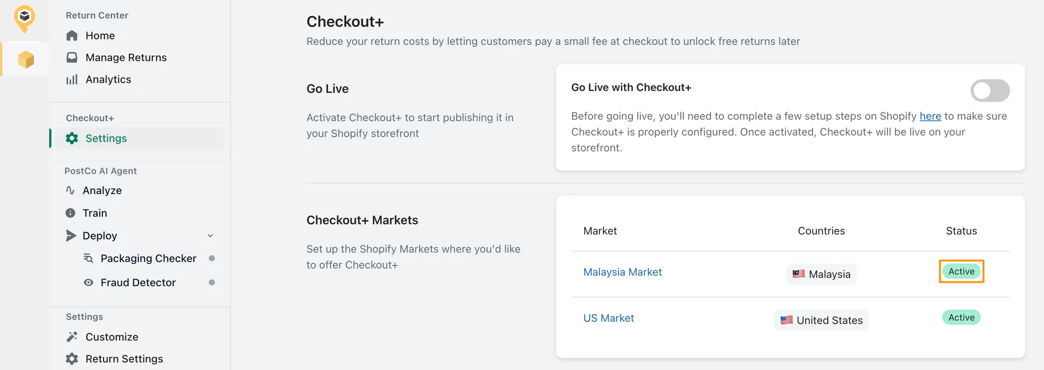 Once a market is successfully added, its status would be updated to ‘Active’ in the Checkout+ Markets section:
