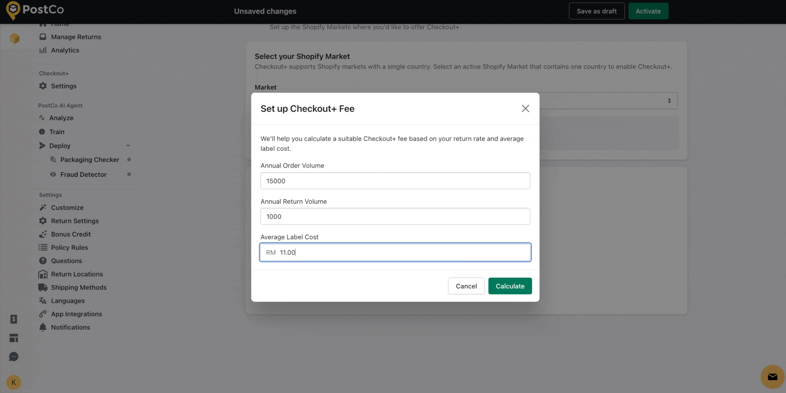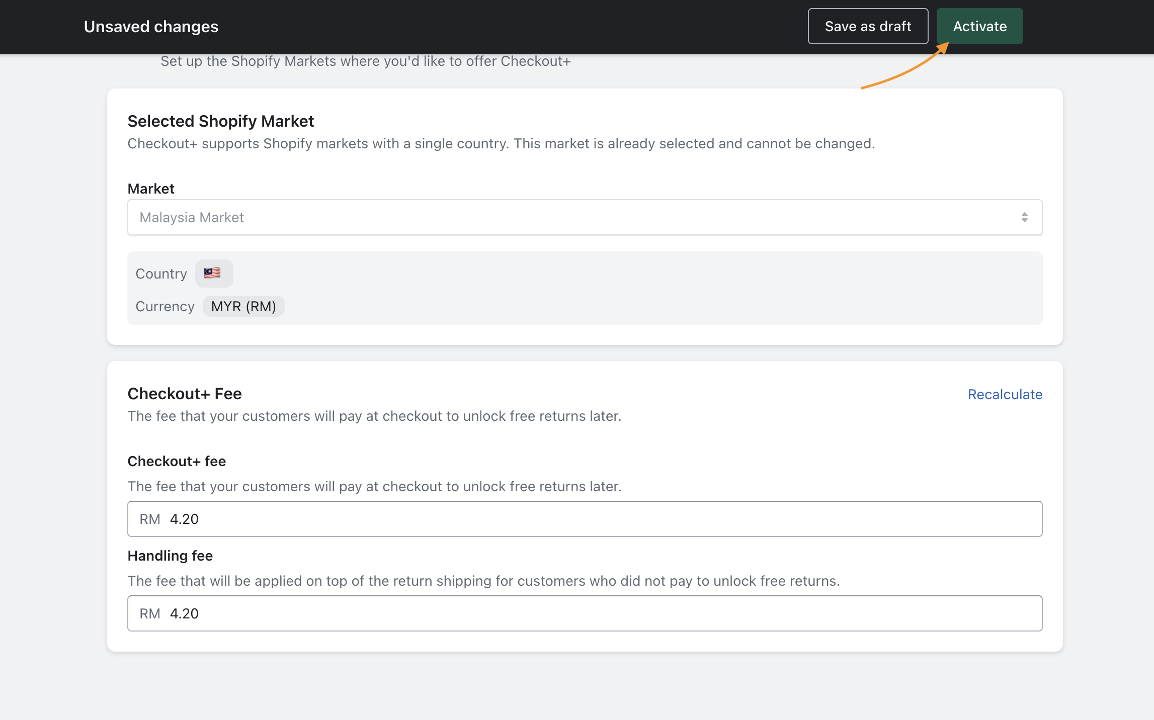 After applying the fees above, simply click 'Activate' to add this market for Checkout+.