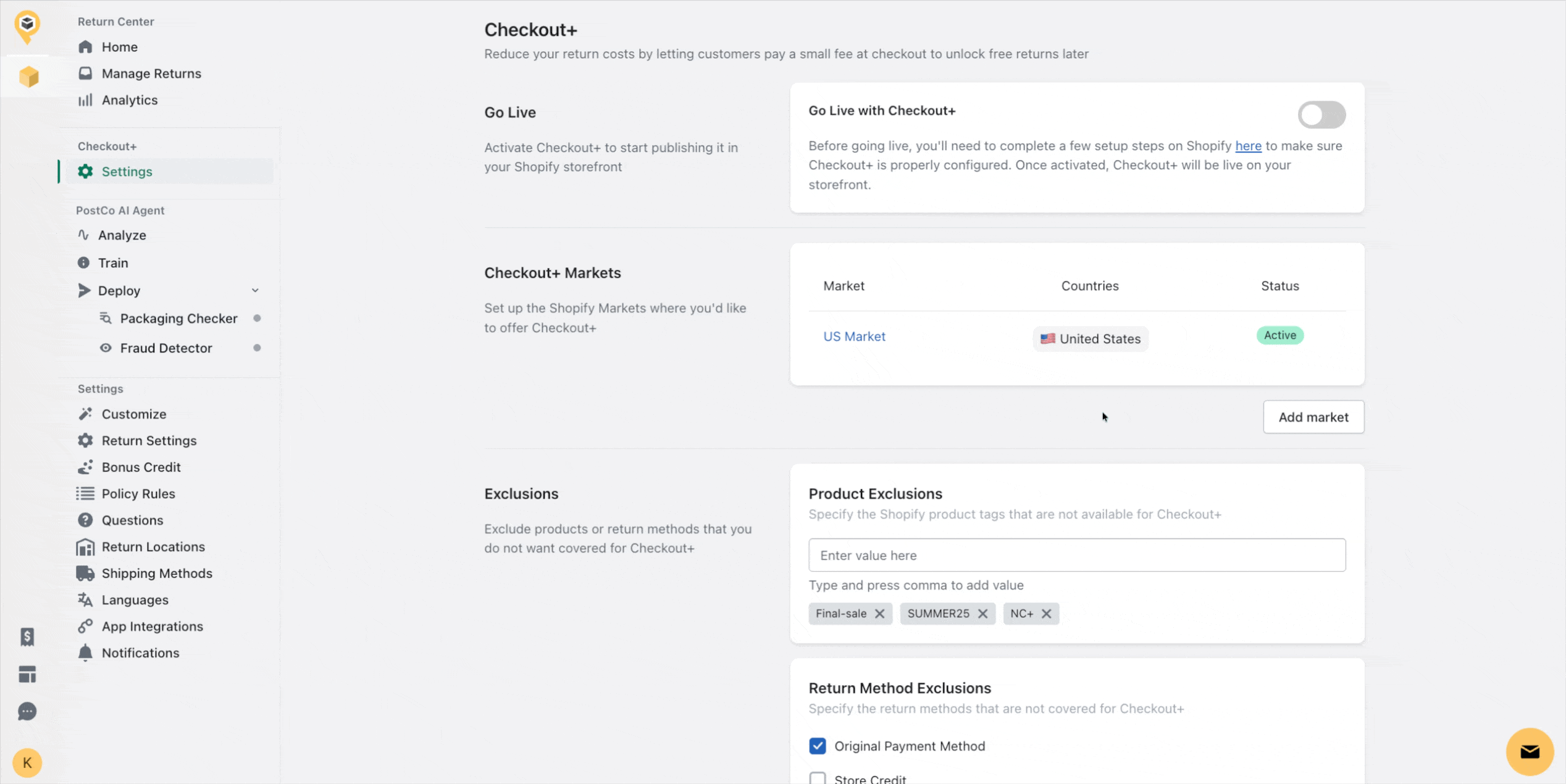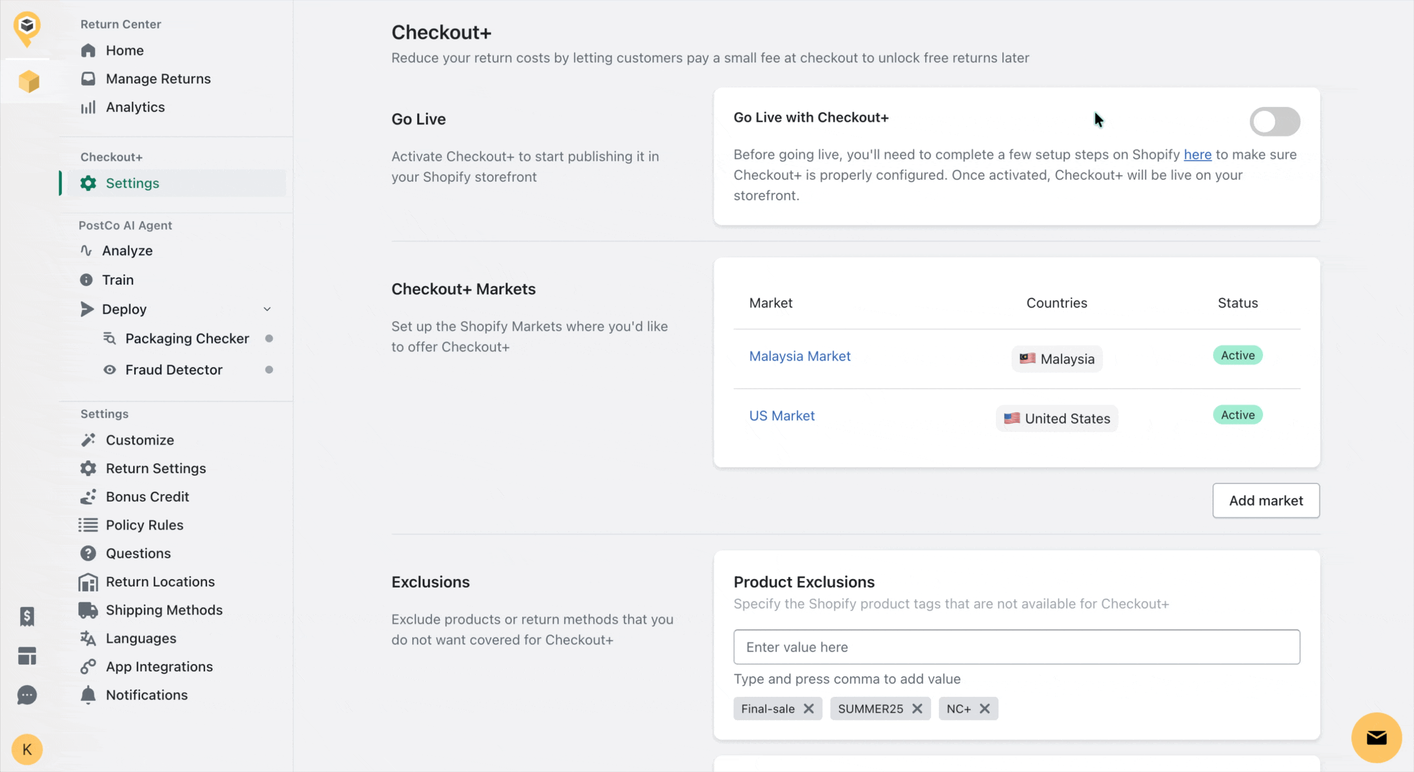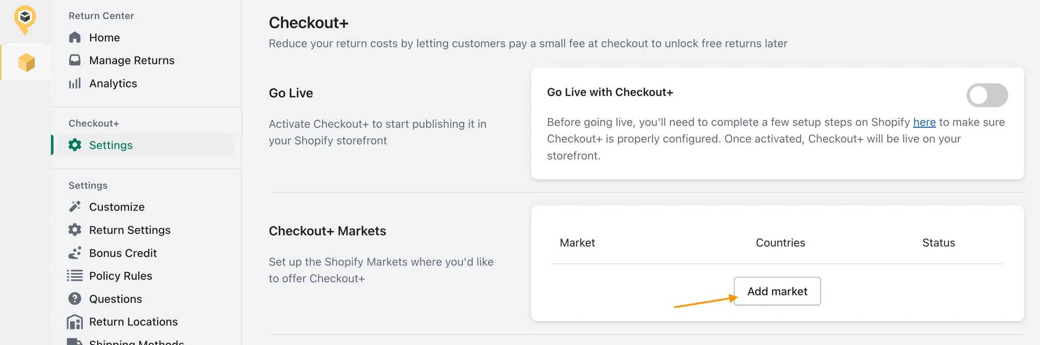 Checkout+ allows customers to pay a small fee at checkout to secure free returns later. This guide walks you through enabling Checkout+ on your store, by adding your Checkout+ markets and configuring the fee shown to customers at checkout.