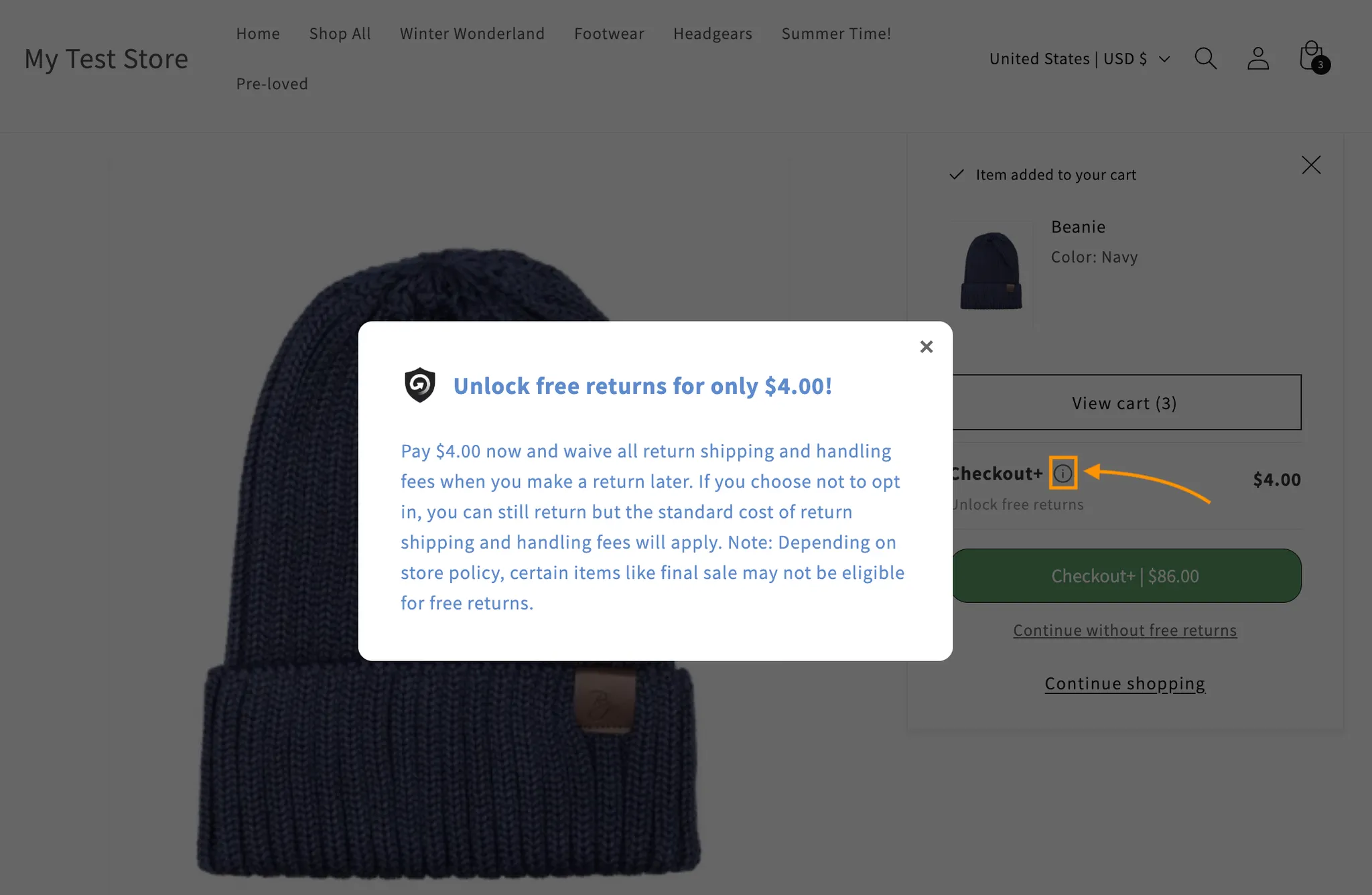 When customers are viewing their basket before checkout, customers will see the option to opt in to Checkout+ on their order. They can click the info icon to learn more, which opens a pop-up explaining the benefits and fees.