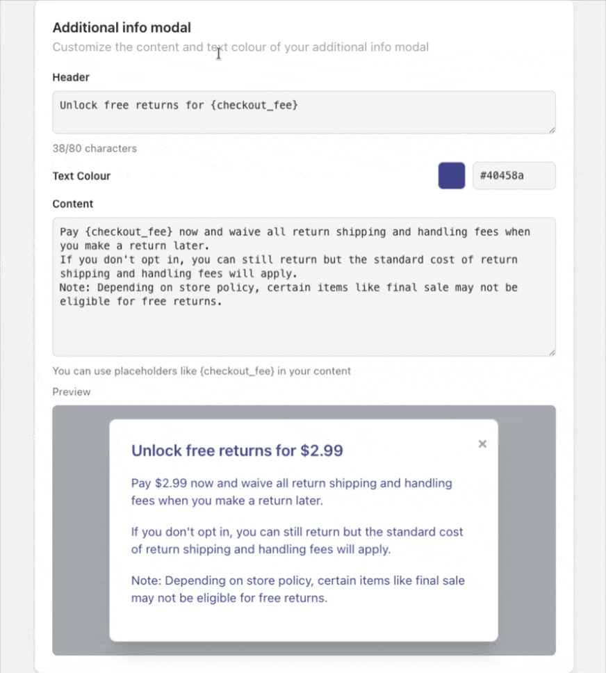 The content of this pop-up can be customised under the Additional Info Modal section. This includes the header, description text, and text colour to match your brand’s tone and style.